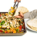 Chicken fajitas just got even easier with this one pan, sheet-pan recipe! Chicken is roasted in the oven with peppers and onions.