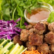 These light and flavorful Vietnamese lettuce wraps are filled with BBQ pork meatballs, crunchy vegetables, and fresh herbs.