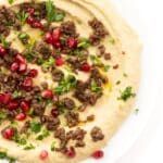 This easy Lebanese appetizer recipe is made with creamy hummus topped with ground lamb cooked in cinnamon then topped with tart pomegranate seeds.