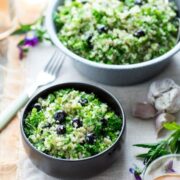 I used fresh blueberries instead of tomatoes and quinoa instead of bulgar wheat for a fresh (and gluten-free) version of Tabbouleh salad! There’s tons of fresh mint and parsley plus a generous amount of zippy lemon garlic dressing. It’s just the thing to bring to a potluck or to serve to company this blueberry season! Plus it’s naturally vegan, so everyone will be able to enjoy it.