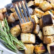 Roasted Eggplant is a quick and healthy side dish recipe that results in a crisp and caramelized outside and tender inside that’s not mushy!