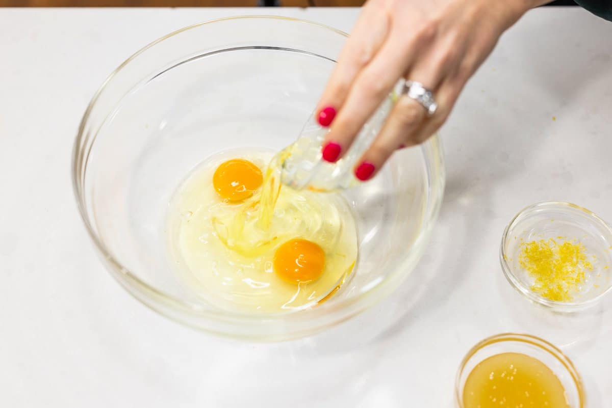 Then add the eggs and egg whites to a large bowl with the other wet ingredients like honey, lemon juice, lemon zest, olive oil, and vanilla.