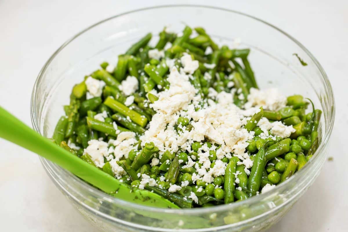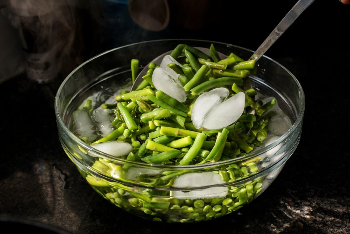 - Bring a large pot of salty water to a boil then add the green beans and asparagus. Cook for 2 minutes before adding in the green peas. Boil for an additional minute before removing with a slotted spoon and submerging in to a large bowl with ice water. Strain and place in a large bowl.