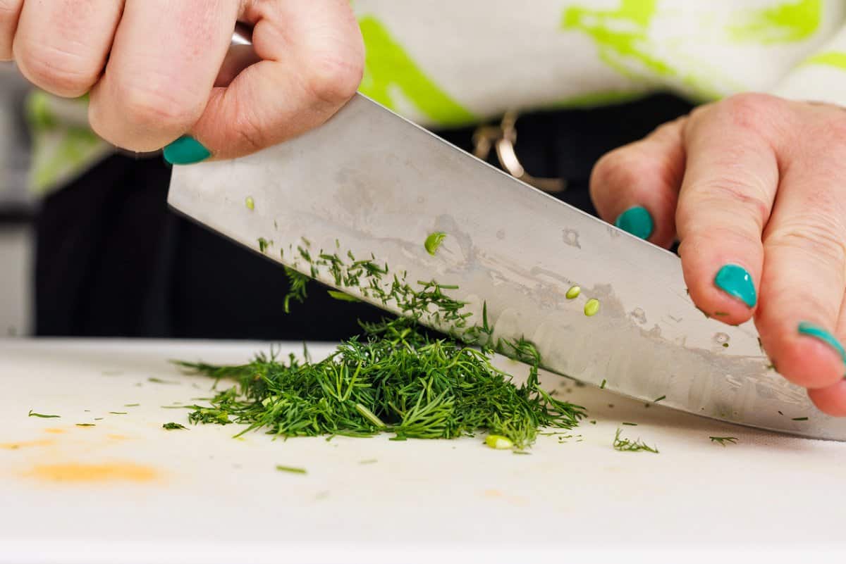 Then make your salad dressing by mincing your fresh herbs. I personally love dill, so did fresh dill and parsley. But you could do whatever is in season at your local grocery store!