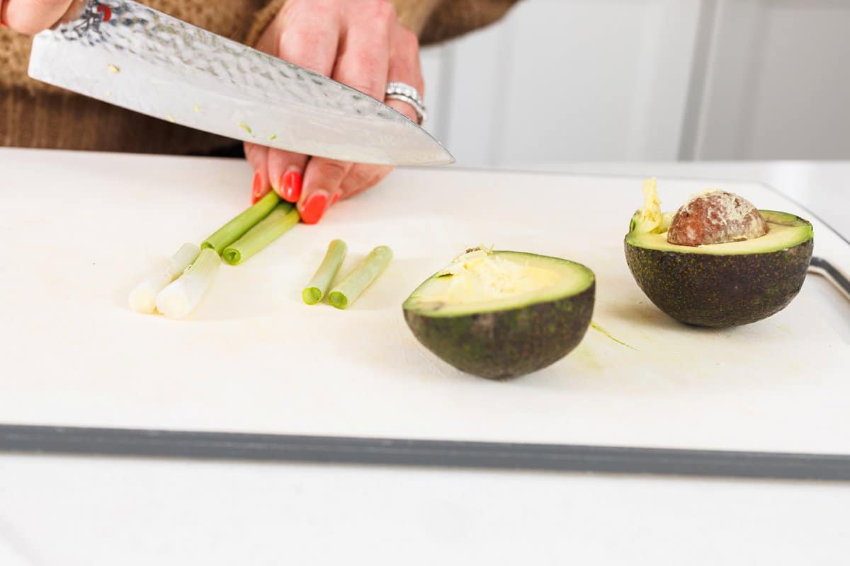 Start your avocado green goddess dressing by trimming your green onions and taking the pit out of your avocado.