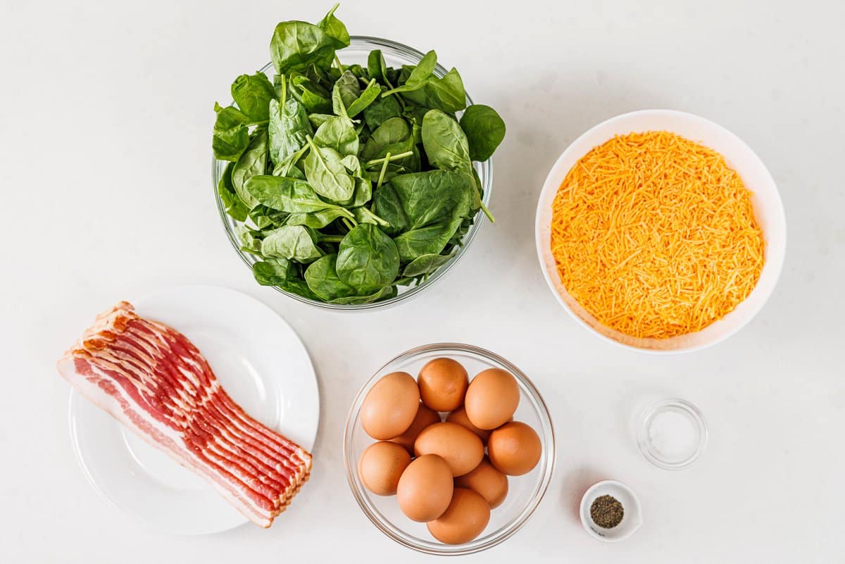 One of my favorite weekend breakfasts and love the leftovers for the week. If I’m short on time, I’ll chop precooked bacon or use bacon bits and chop spinach and just mix with the eggs and bake. Delicious!!!