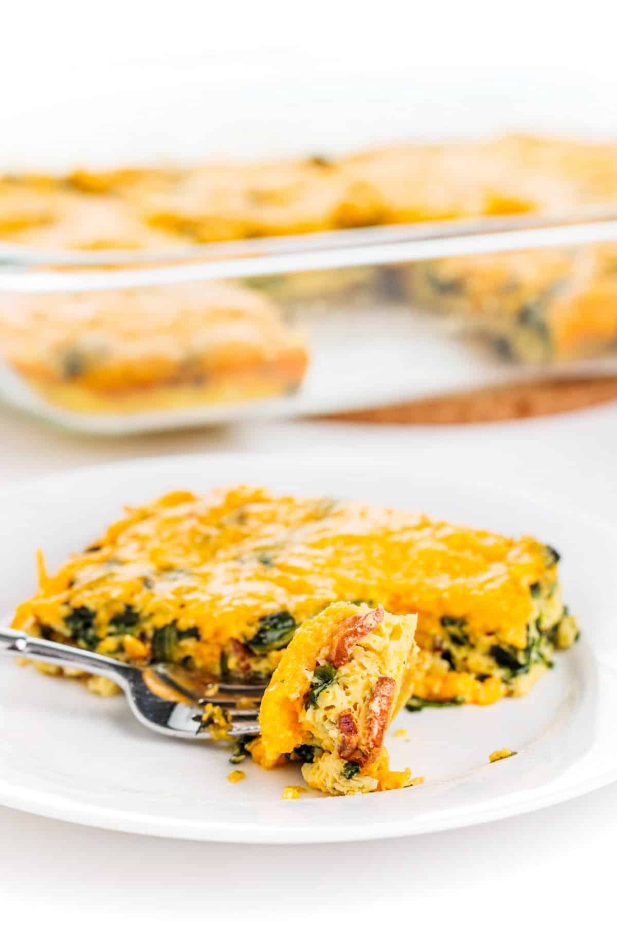 Forkful of bacon and spinach egg casserole.