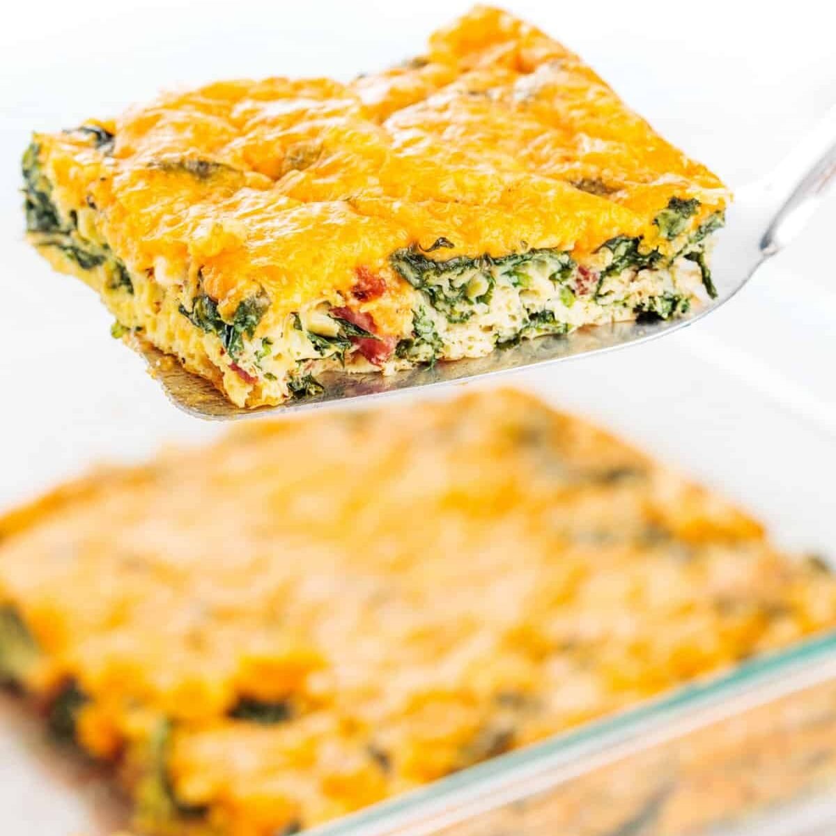 This low carb, high protein egg casserole is made with bacon, spinach, and cheese. Ideal for prepping ahead and enjoying for breakfast all week long!