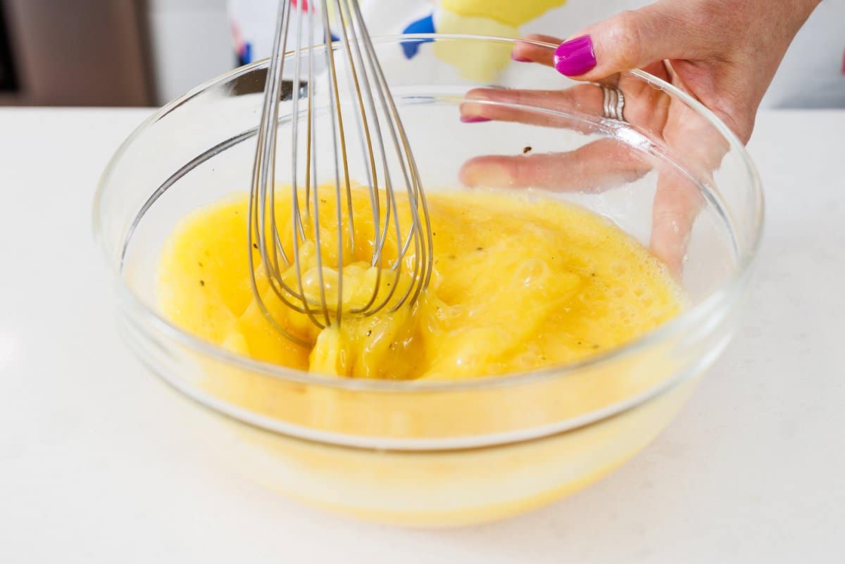 Step 4. Whisk your eggs with some salt and pepper to taste, and with some water to make them nice and fluffy. Then add the spinach and bacon and mix well.