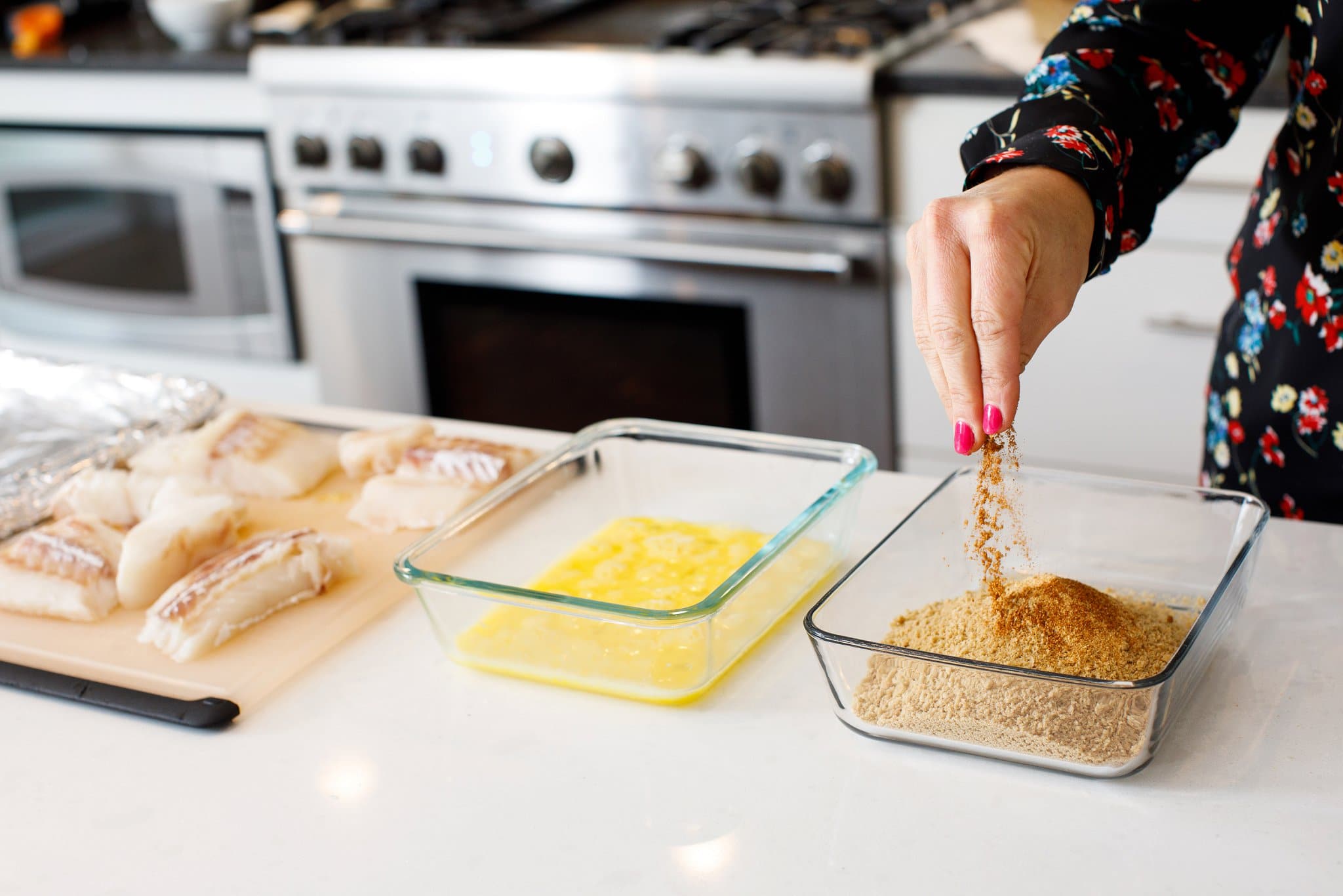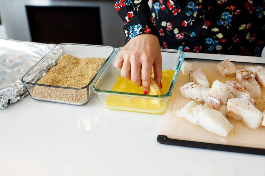 • Egg: Coats the fish to help the bread crumbs stick and get an even, crispy bake.