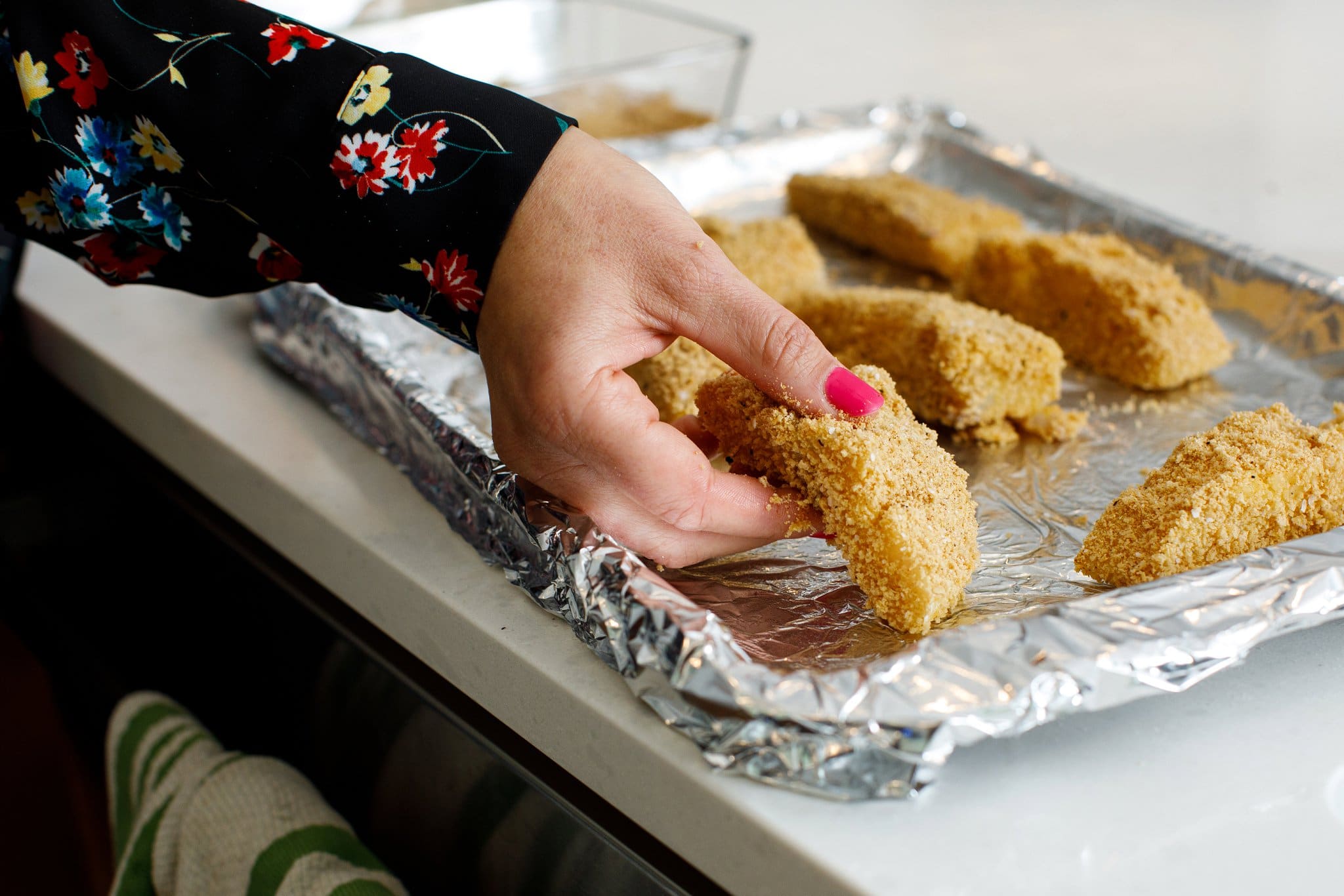 4. Sprinkle both sides of the fish strips with the remaining 1/2 teaspoon of salt. Dip fish in egg then coat evenly with panko mixture. Place on lined baking sheet and continue until all fish is coated in panko.