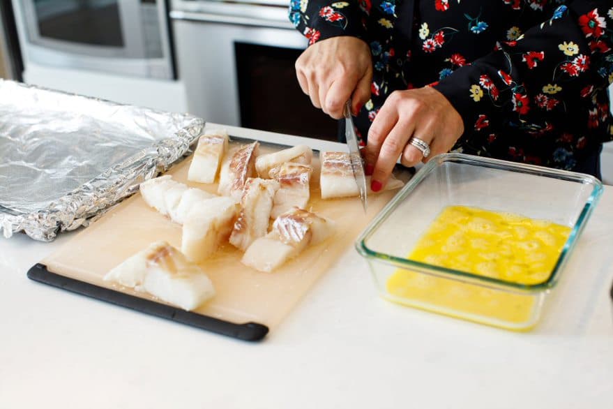 Start your crispy baked fish sticks by cutting your fish fillets into 1-2 inch thick sticks.