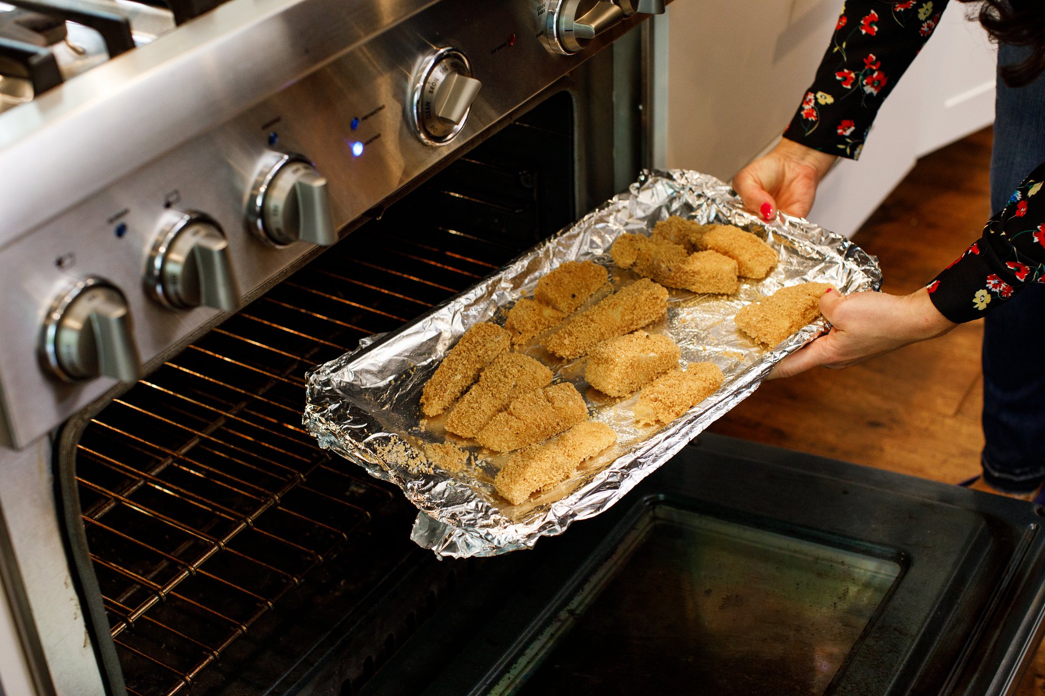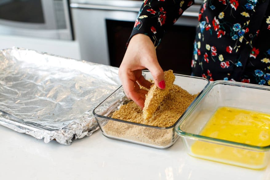 Place on a prepared baking sheet, and repeat until all fish sticks are coated and on the baking sheet.