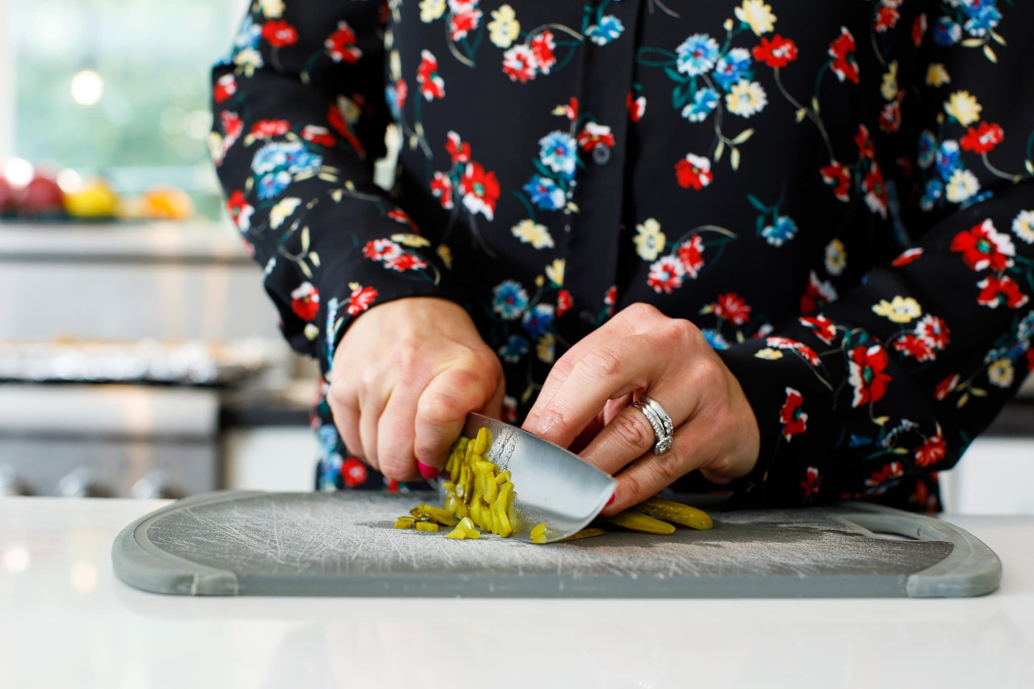 Then finely chop your dill pickles and add them to the yogurt.