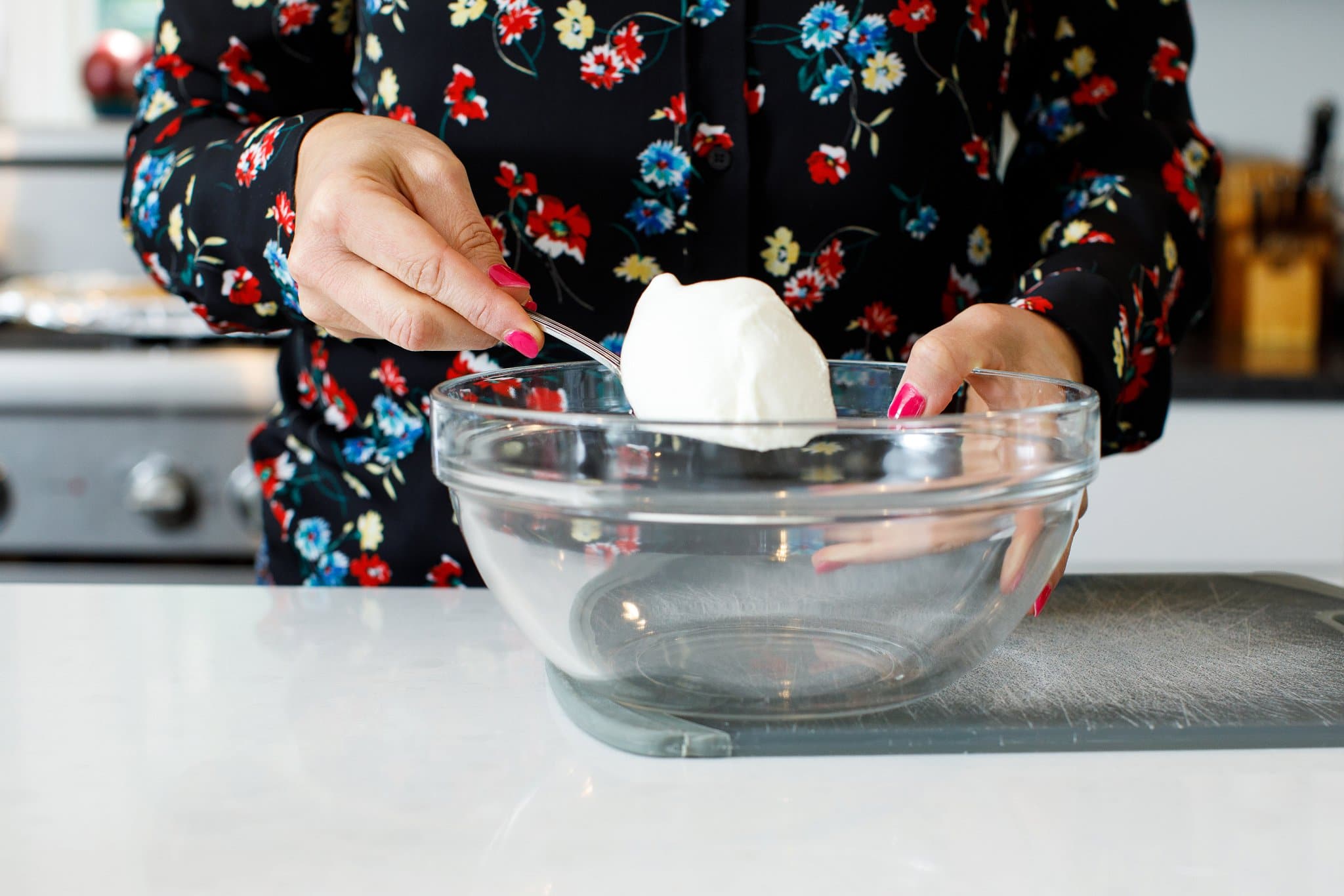 While fish sticks bake, make your tartar sauce. Start by adding your plain yogurt to a medium bowl.