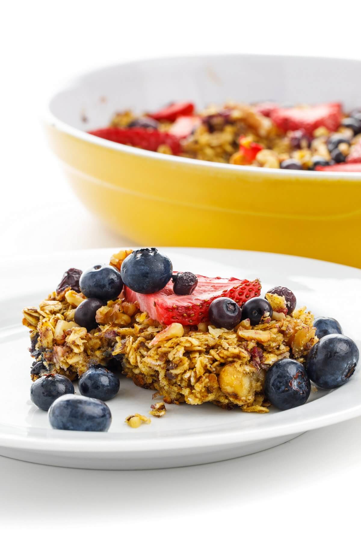 Baked oatmeal is simply oats baked with fruit and nuts then sliced into squares to serve. You can use any nuts or fruit you have on hand. For added flavor, we love cinnamon and nutmeg but this will be just as delicious without any spices.