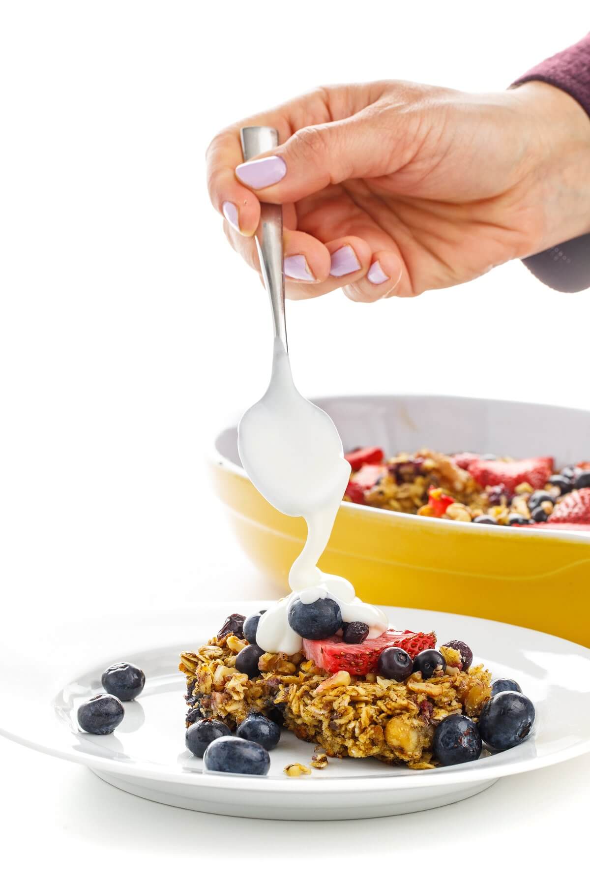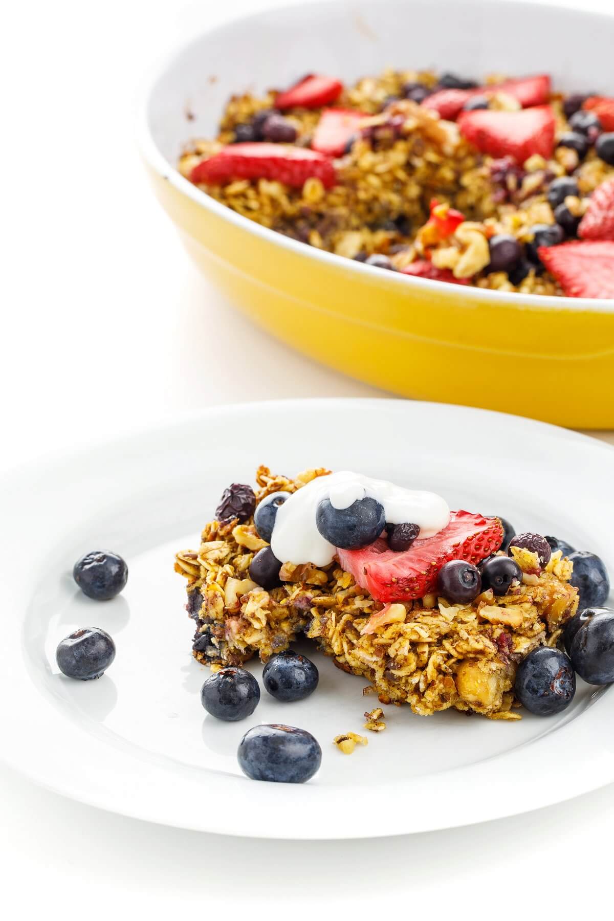 Naturally gluten-free, this easy baked oatmeal can be made ahead and is made with oats, eggs, berries and a little bit of maple syrup.