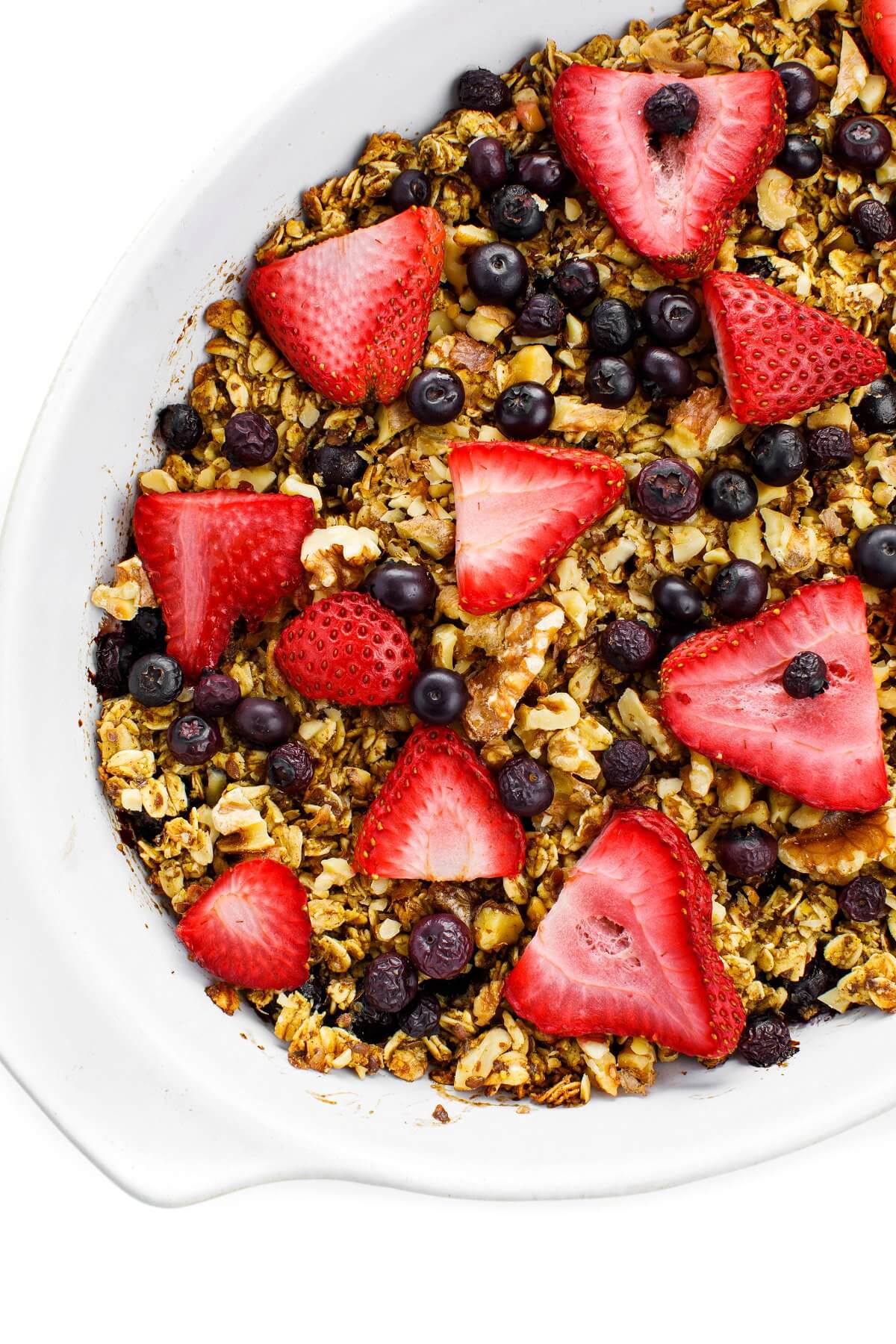 This easy make-ahead breakfast recipe is ideal for feeding a crowd! Naturally gluten-free, this baked oatmeal is made with oats, eggs, berries, and a little bit of maple syrup.