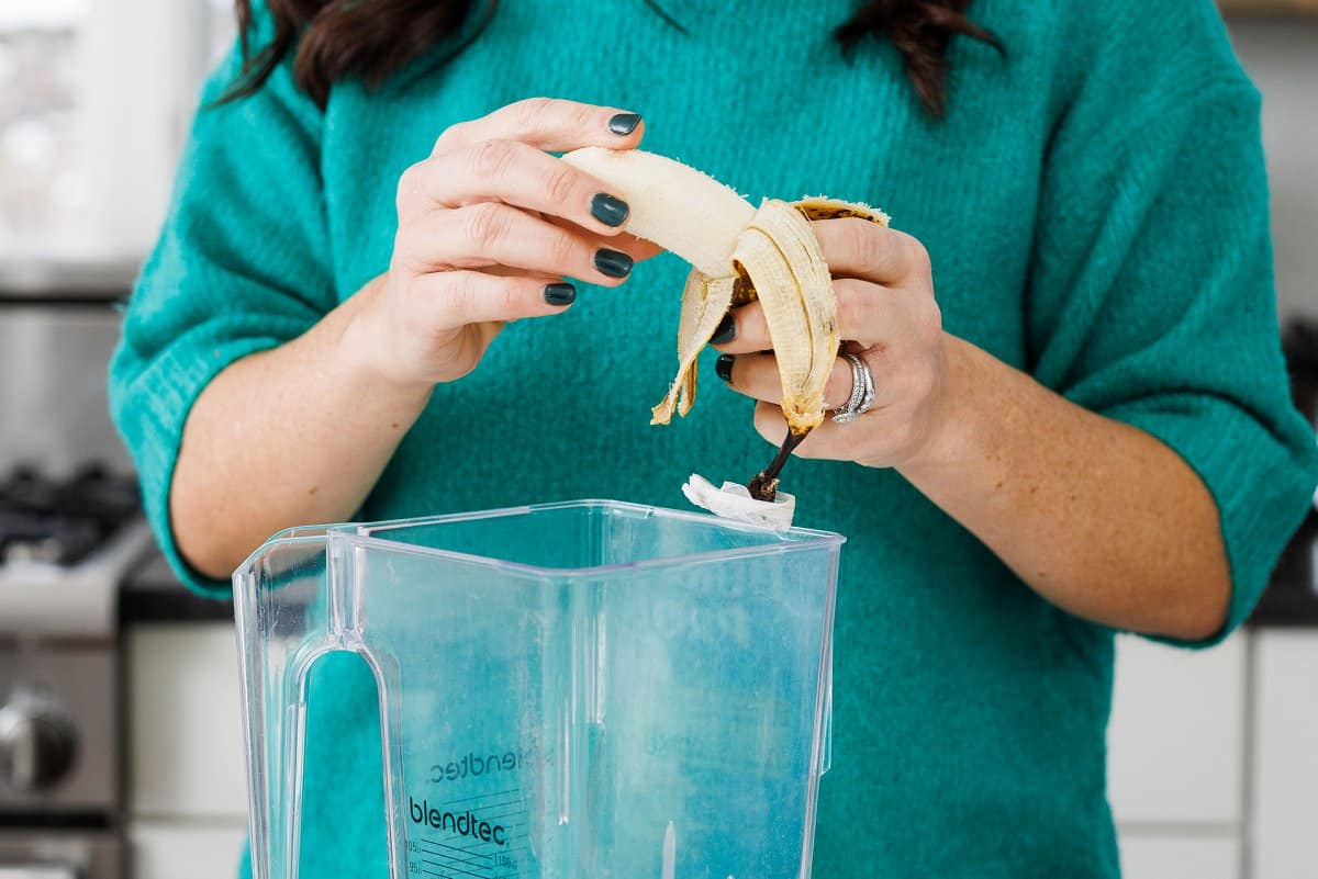 Start your banana raspberry chia smoothie by peeling your banana and adding it to your blender.