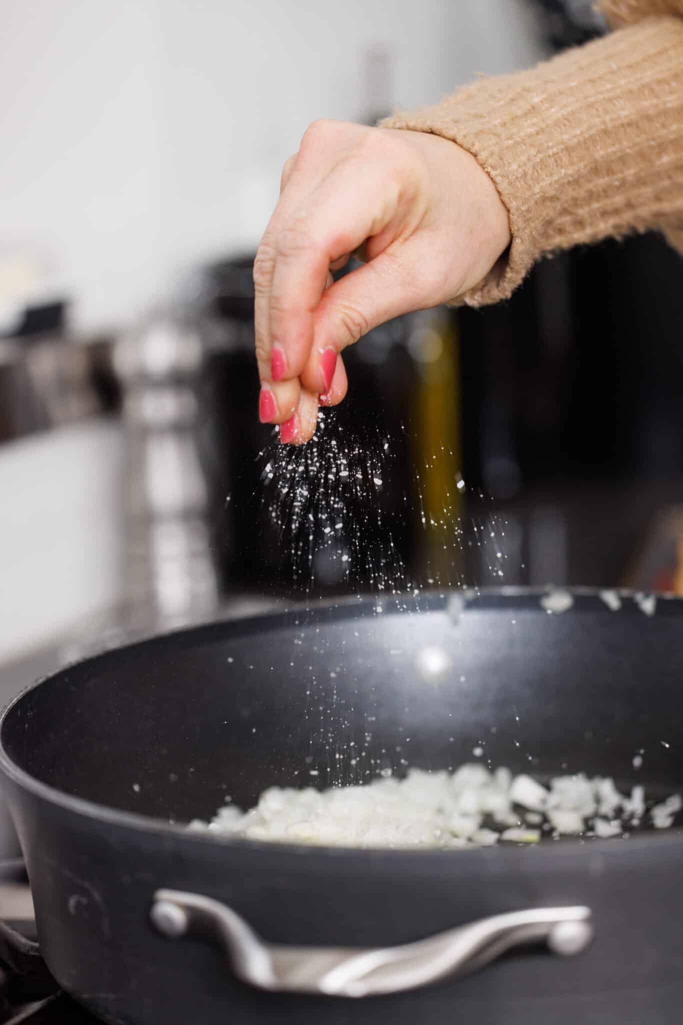 Then add your onion and carrot to a pan, with a sprinkle of salt.