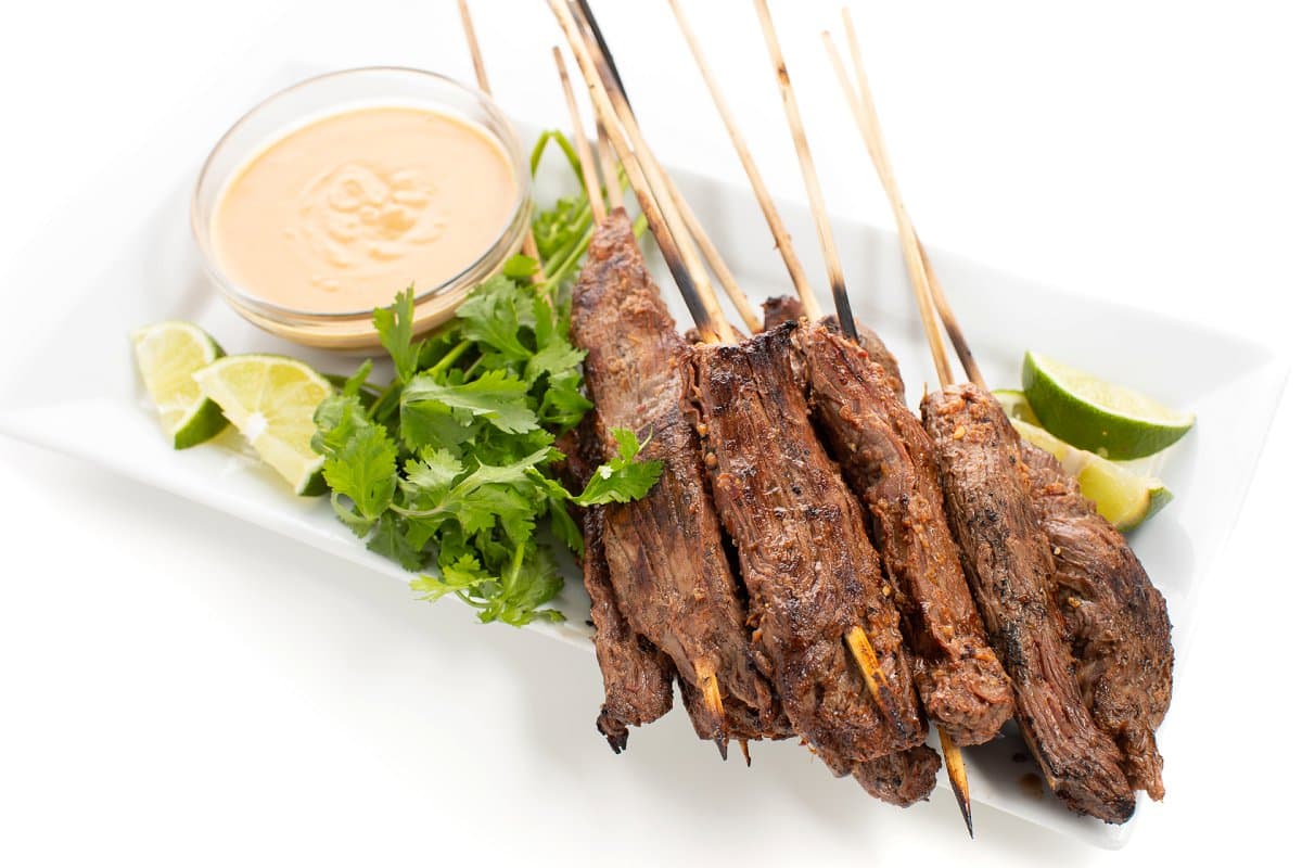 These mouth-watering Thai beef satay skewers with peanut dipping sauce are tangy, tender, and perfectly balanced with a cool and creamy dipping sauce.
