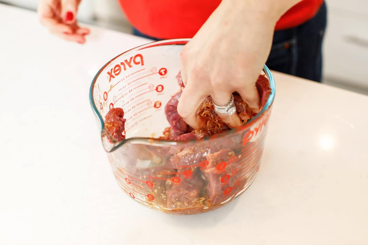 Add your beef strips and mix until thoroughly covered in the marinade and let marinate for at least 30 minutes.