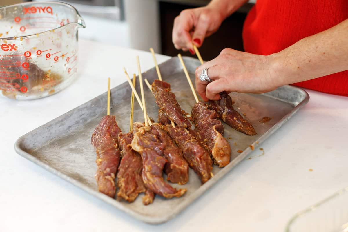 Once beef has marinated, take them and skewer them.