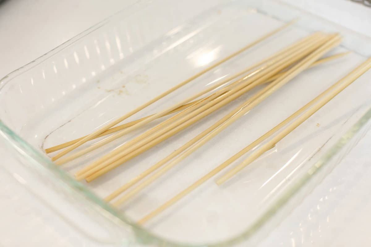 While the beef marinates, take your wooden skewers and soak them in water. This makes it so that they won’t catch on fire when cooking on the grill.