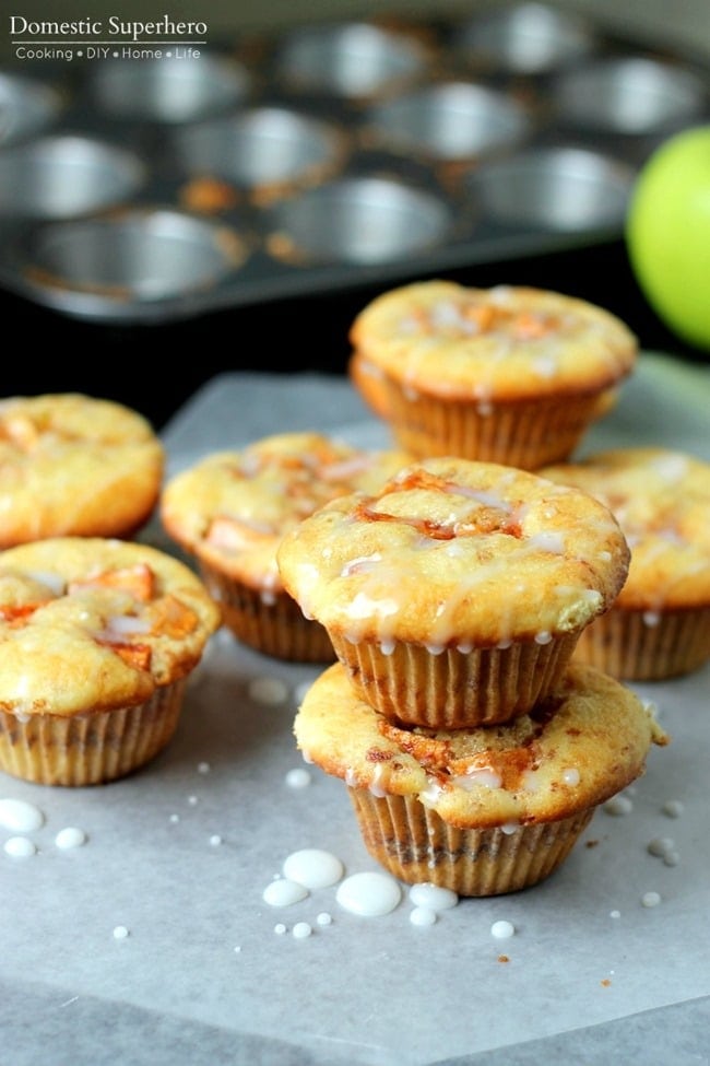 Baked Apple Fritter Muffins are filled with delicious tender apples, brown sugar and topping with a dreamy glaze. Perfect option for baking, not frying!