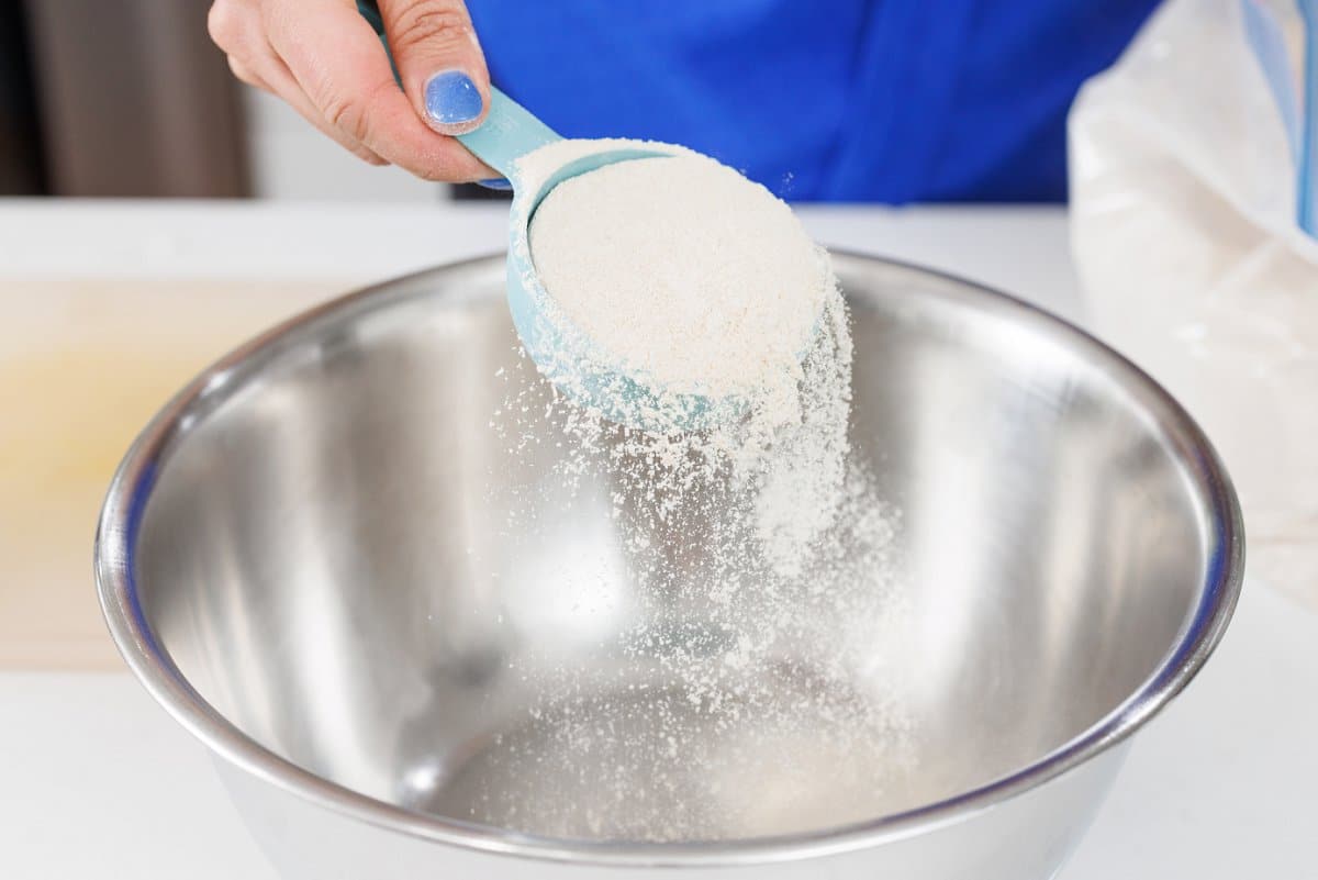 Start your blueberry Greek yogurt waffles by taking a large bowl and adding the flour.