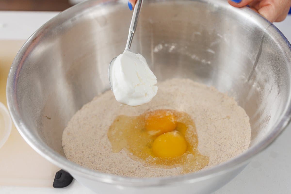 2. Using a wooden spoon, form a small whole in the middle of the dry ingredients. Whisk together eggs, yogurt and vanilla then stir to combine with the dry ingredients.
