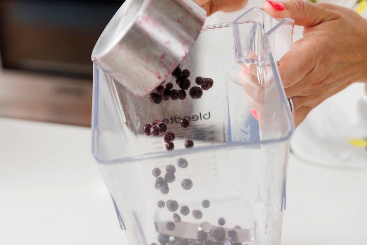 Start your high protein blueberry kale smoothie by adding your blueberries and banana to your blender. I like to use frozen blueberries so I don’t have to add as much ice.