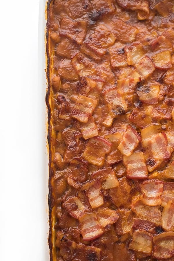To keep the beans creamy and moist, I top the entire pan with pieces of bacon before baking until golden brown and bubbly. The smoky bacon is the perfect balance to the sweet molasses and acidic vinegar.