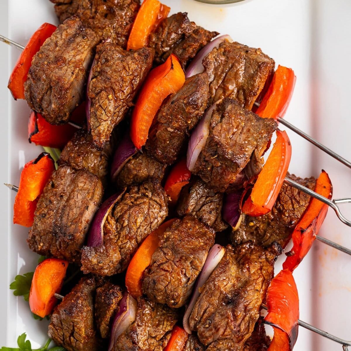 Steak skewers with tahini sauce on a platter with fresh parsley and broiled onion and peppers.