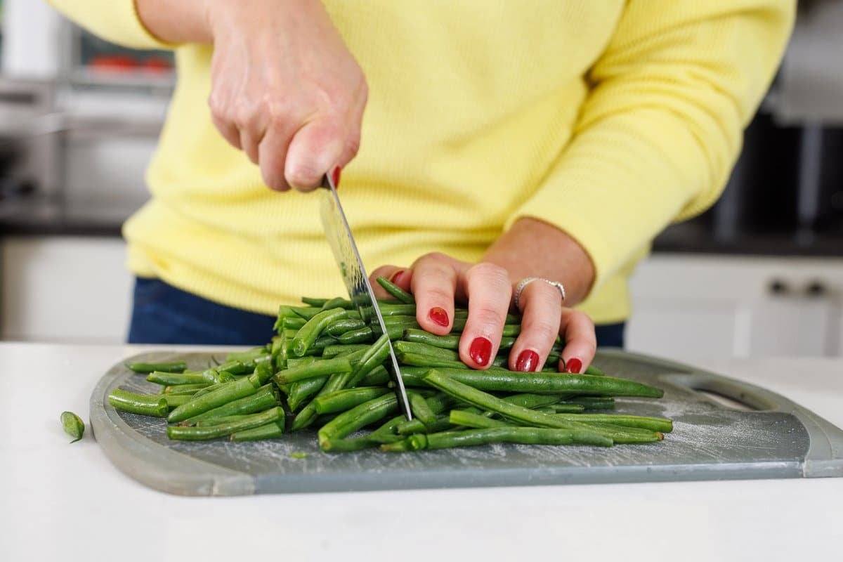 Start your Chicken and Green Bean Stir-Fry by washing and trimming your green beans, and cutting and seasoning your chicken breast.