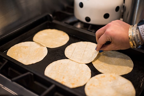 - Preheat oven to 350 degrees. Heat a large frying pan or non-stick griddle over medium-high heat and add canola oil. Carefully fry each tortilla one by one, about 2 minutes per side; set aside keeping warm in a towel until you’ve fried all 32 tortillas.