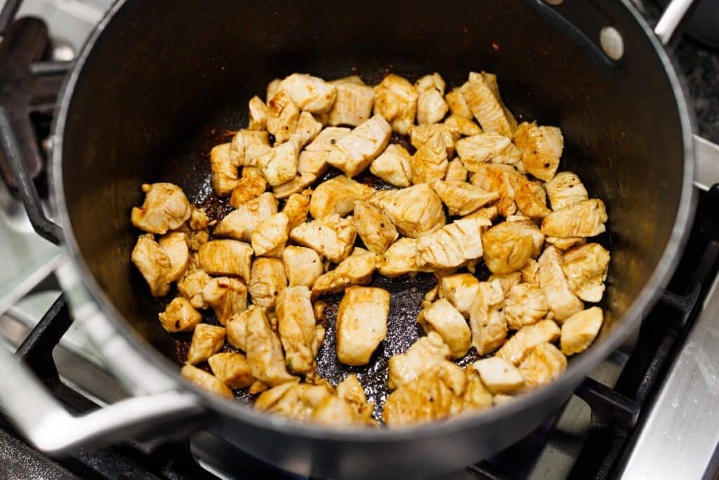 Step 5. In the bottom on a large pot, drizzle and heat some olive oil before adding the chicken and cooking until golden brown. Then remove and set aside.