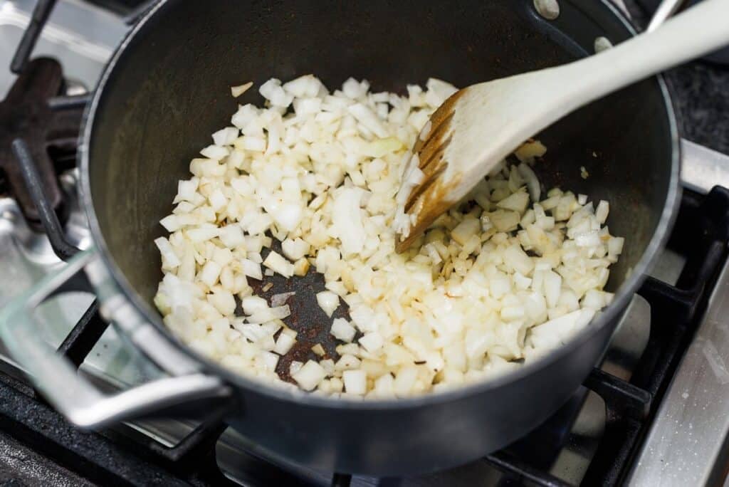 Step 6. In the same pot, add a bit more olive oil and add the diced onion and minced garlic.