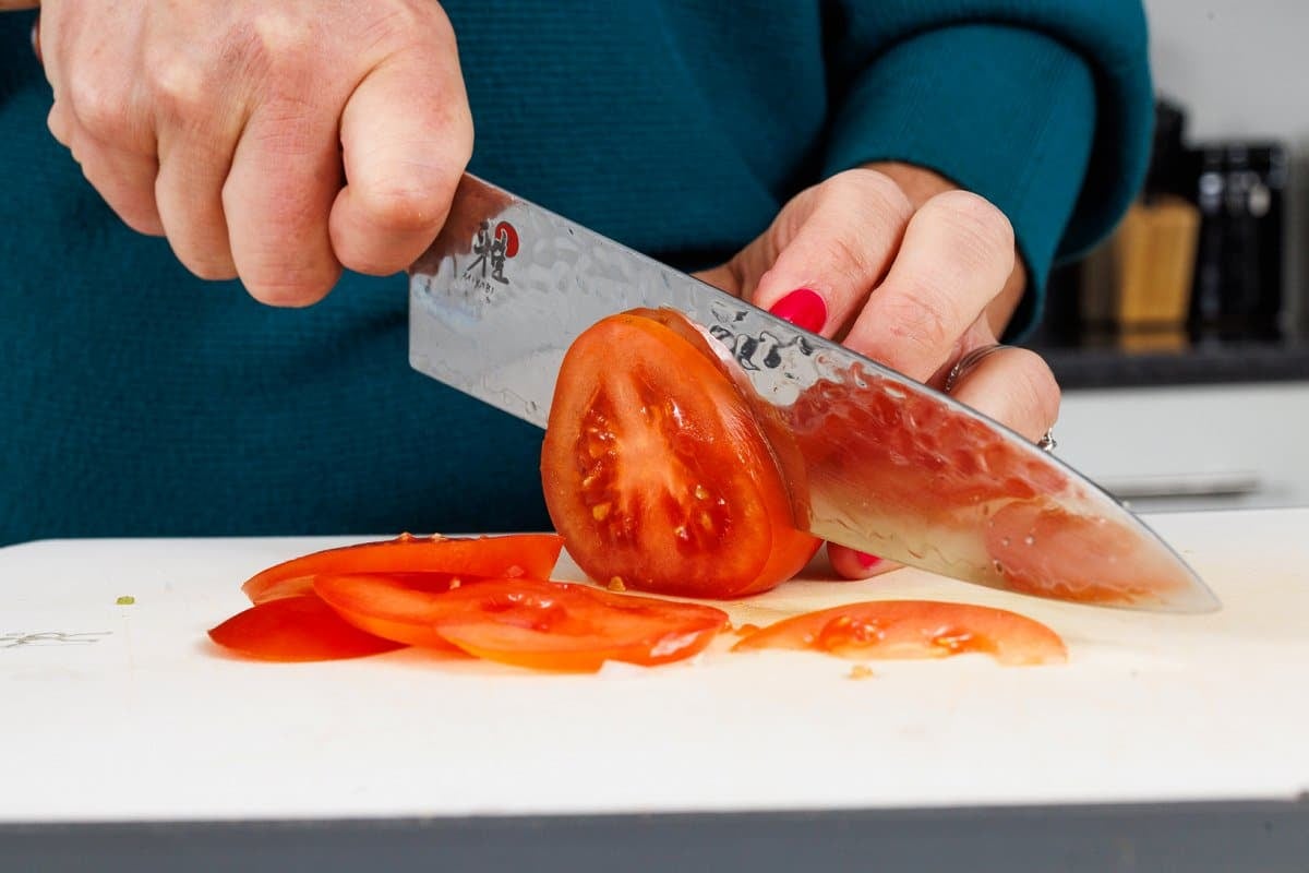 Then prepare any toppings. I like to include sliced tomato, lettuce or another leafy green, and red onion.