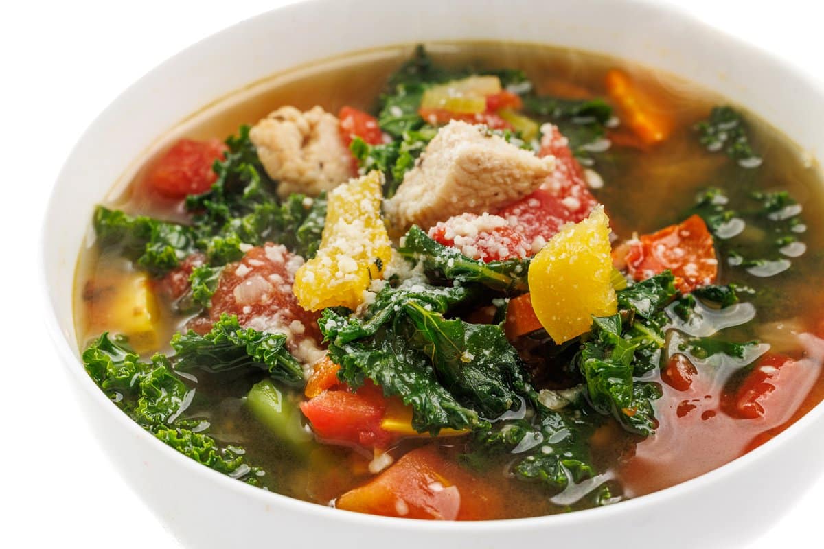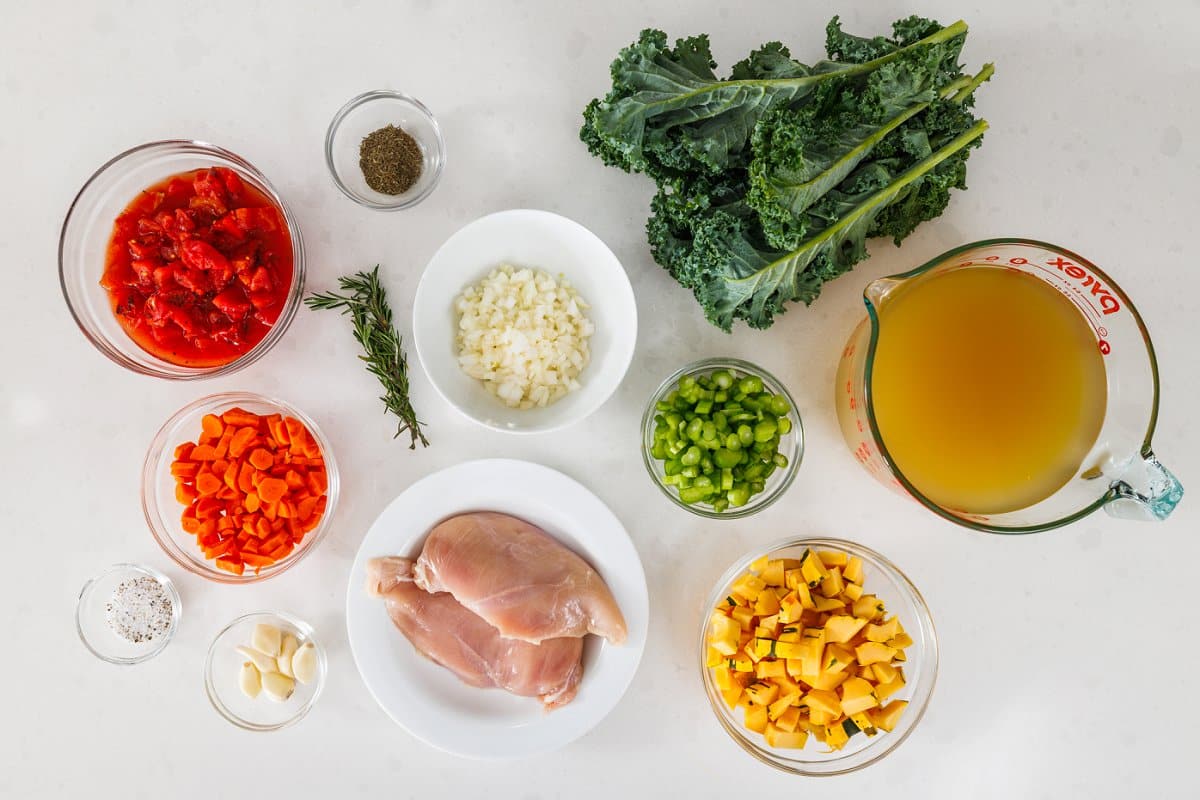Are you getting bored with your chicken recipes? Soups and stews are the perfect solution for turning everyday chicken breasts into a healthy and delicious one-pot meal, and you can really let your produce drawer guide your way as well. The options are endless and fortunately, soup is extremely forgiving. That’s how I came up with this Chicken Soup with Delicata Squash and Kale, a delicious and quick meal the whole family can enjoy!