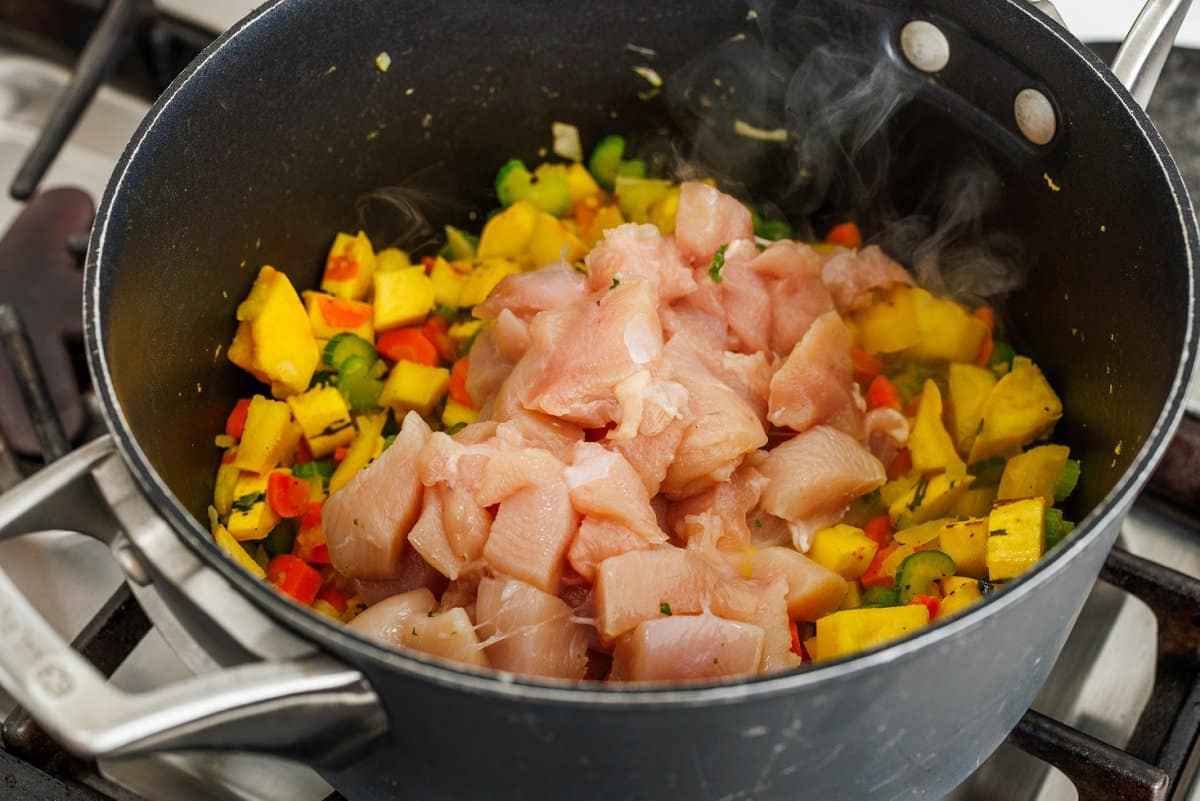Then add it to the pot with the vegetables, along with the rosemary and some more salt and pepper. Stir and cook until chicken is browned.