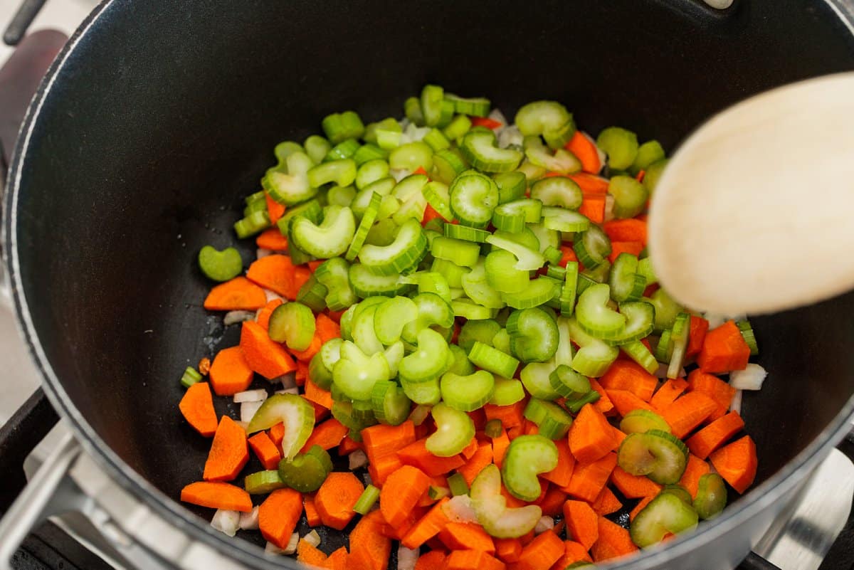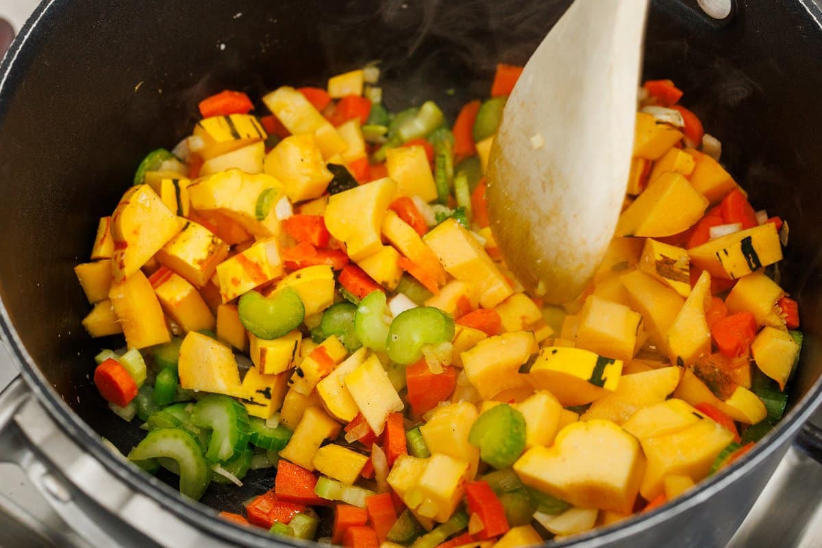 2. Sauté onions, garlic, carrots, celery, and squash for 5-7 minutes or until tender, stirring frequently. Add a bit of salt and pepper to release juices.
