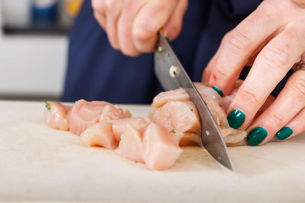 While veggies are sauteing, cut your chicken breasts into cubes.