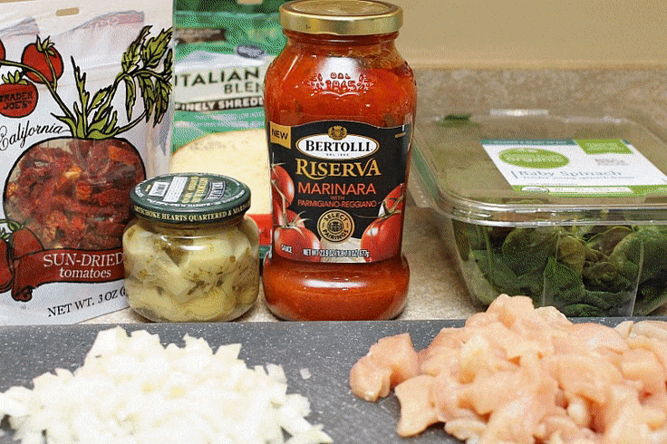 Start by sauteing some onion in olive oil. Add in the garlic and wait for your kitchen to smell amazing. Add in your chicken and cook until no longer pink. Stir in the Riserva Marinara and some chicken broth. Pile in the diced artichoke hearts and sun dried tomatoes. Bring to a boil. Tuck in your noodles, cover, and let simmer. Add in your spinach. Stir. Top with cheese and cover until you have melty goodness. That easy.