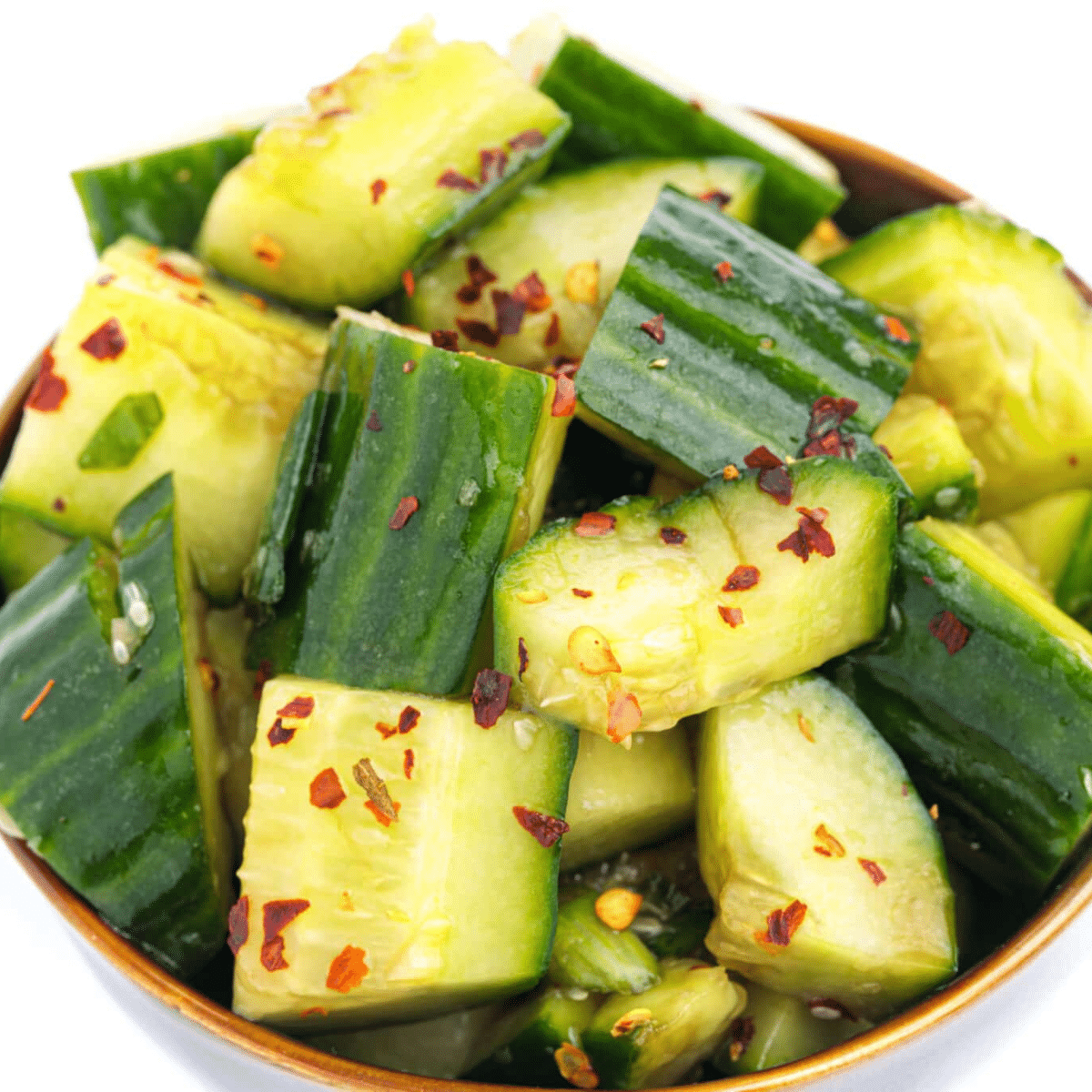 Chinese smashed cucumbers in a bowl topped with chili flakes.