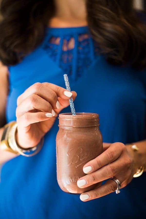 For a rich chocolate flavor without a lot of added fat and calories, I add in cocoa powder before blending the smoothie. You can use regular or dark chocolate cocoa powder. Either way, don’t be shy – cocoa powder is a great source of antioxidants.
