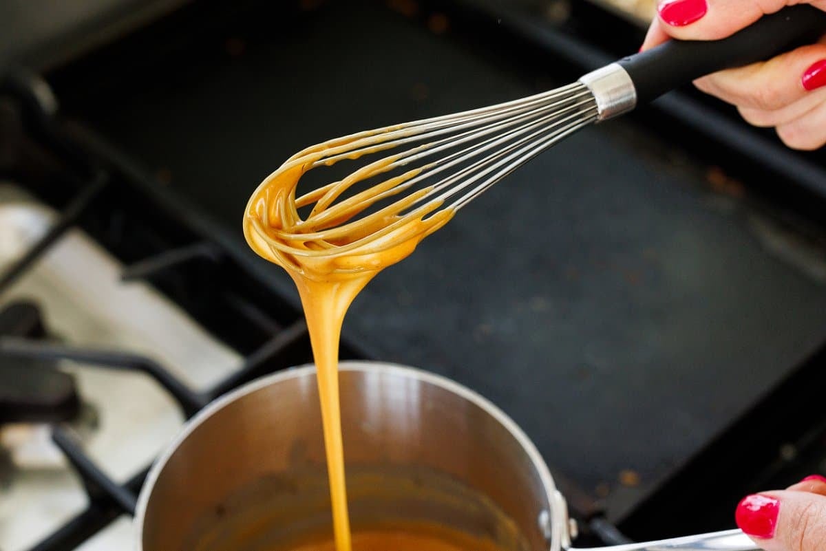 3. In a small sauce pot, melt peanut butter and honey until smooth and creamy over medium heat. Remove from the heat once bubbles start to form around the edges – careful not to bring to a full boil. Whisk cinnamon, vanilla and salt into the peanut butter mixture. Mixture should be thin – the consistency of melted caramel sauce.