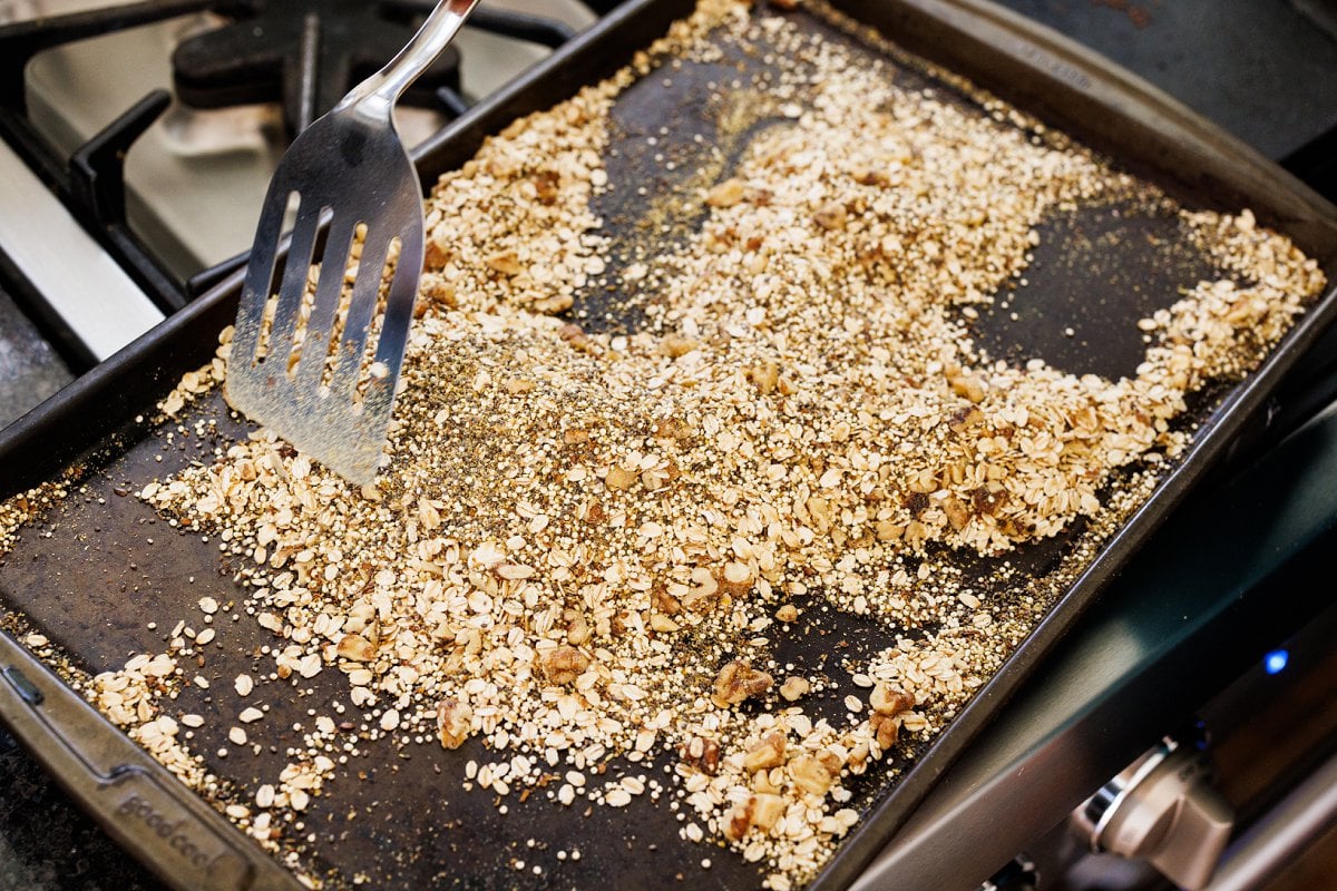 Spread the nuts, oats, quinoa, flax, and chia seeds on a baking sheet and toast for about 10 minutes.