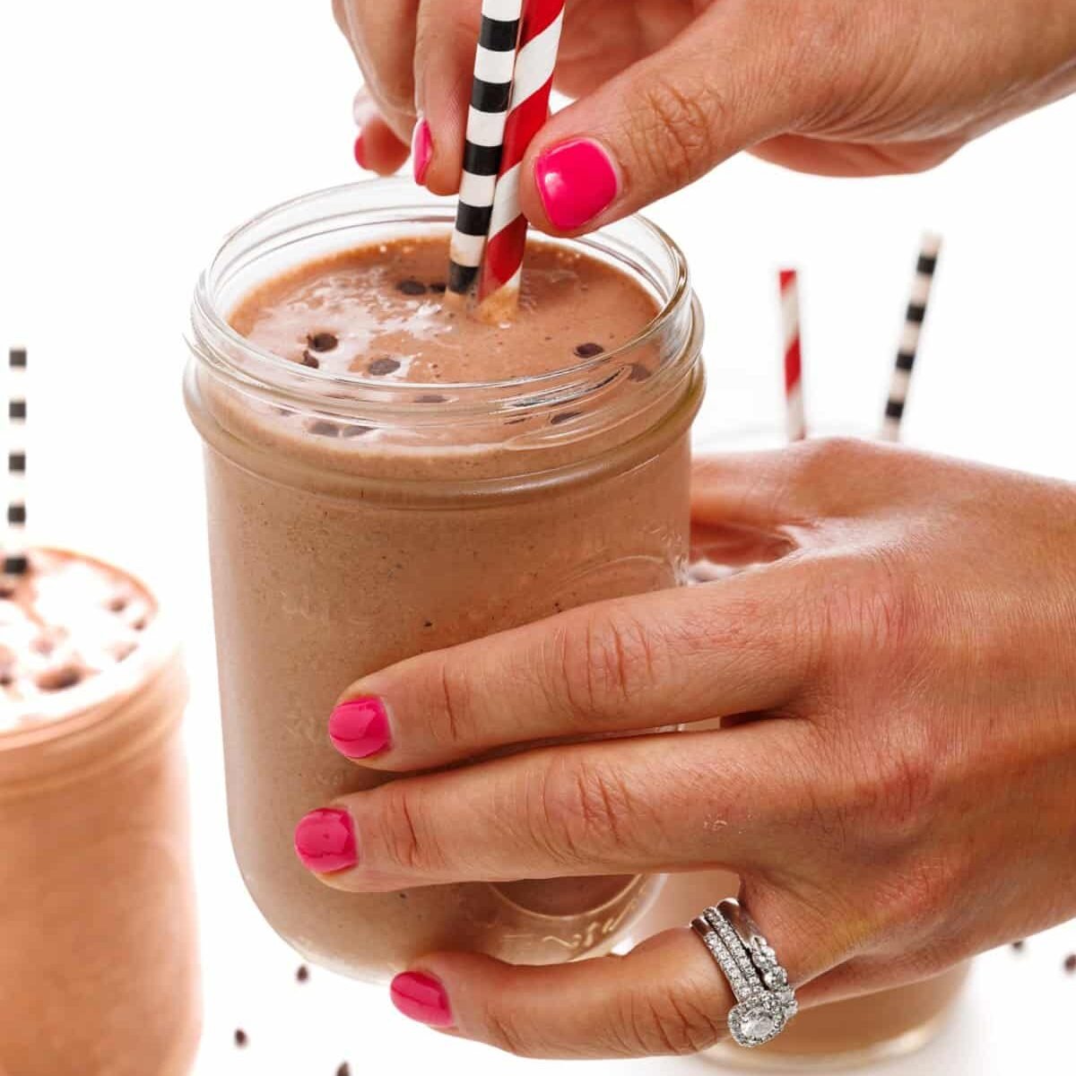 Chocolate strawberry protein smoothie in mason jar glasses.