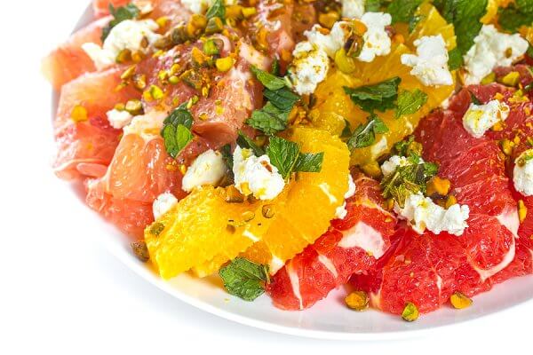 This quick and easy Winter citrus salad is topped with goat cheese, pistachios, mint and olive oil. Simple enough for a casual weeknight dinner but elegant enough for entertaining.